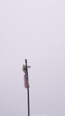 These appear to be a pair of elegant drop earrings. They feature a large, triangular pink stone in the center, surrounded by a delicate circle of smaller stones. Below the circle, there is a dangling drop adorned with more stones. The earrings have a gold-tone setting and give off a vintage vibe.